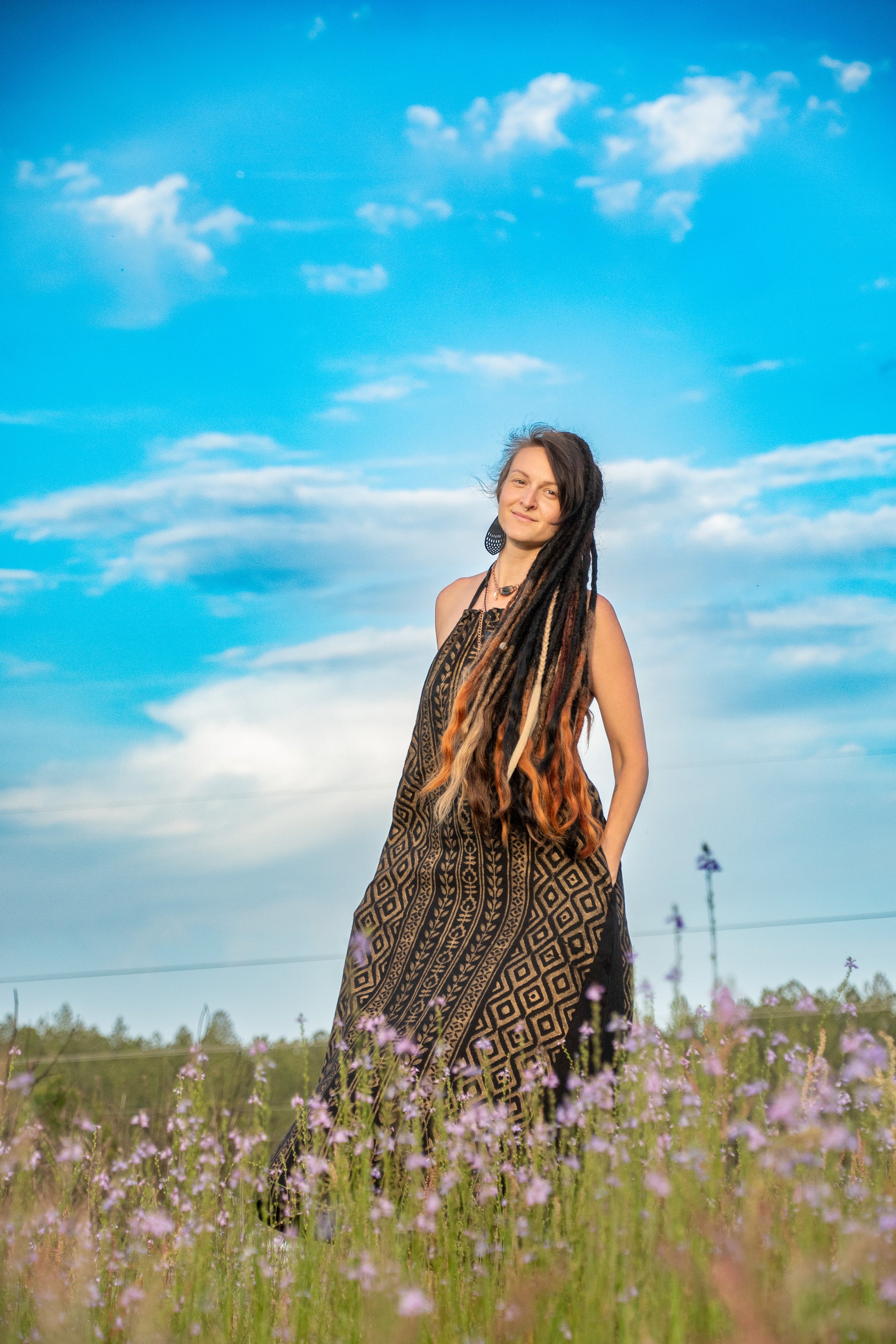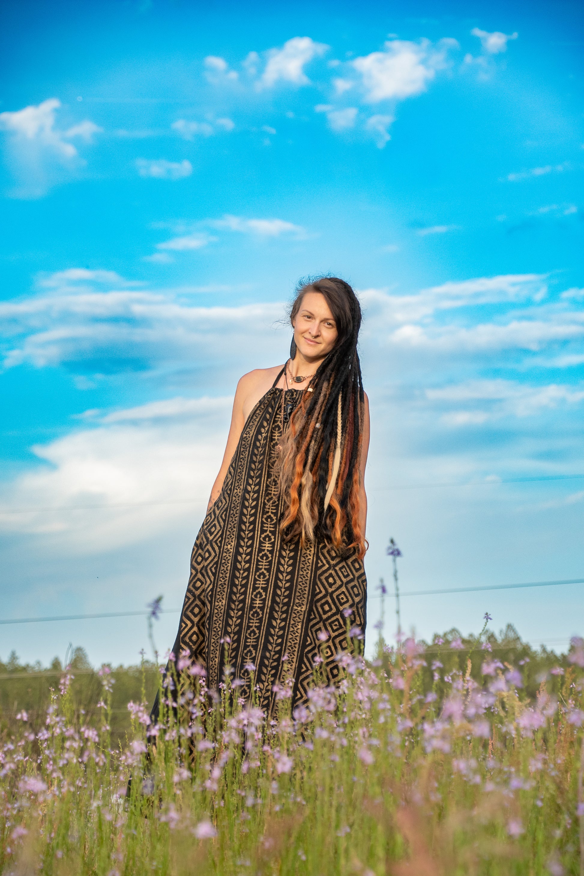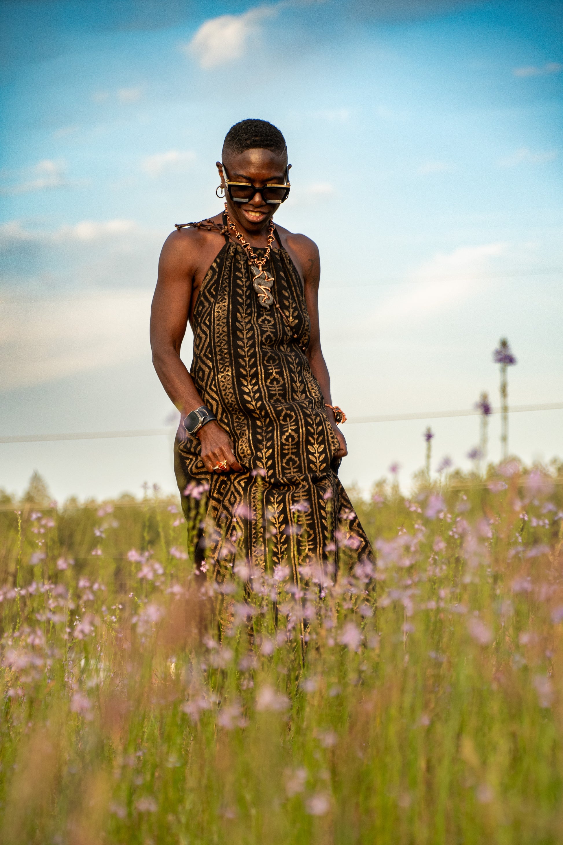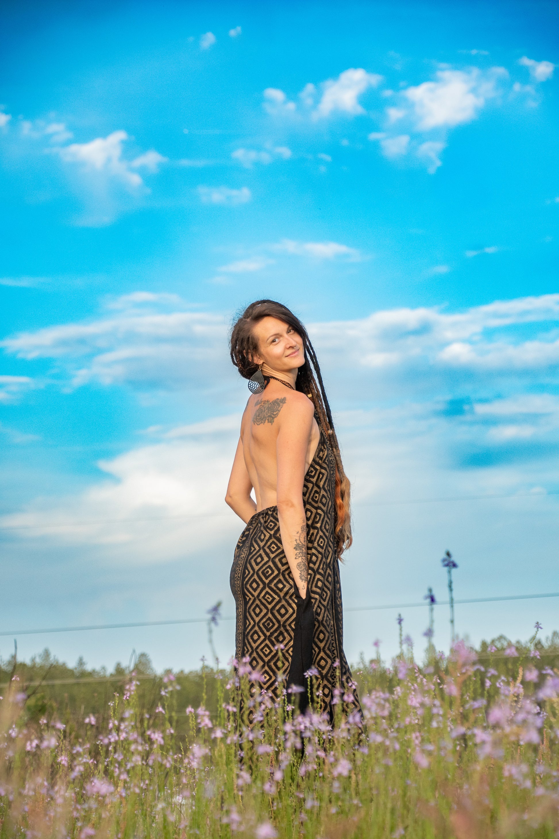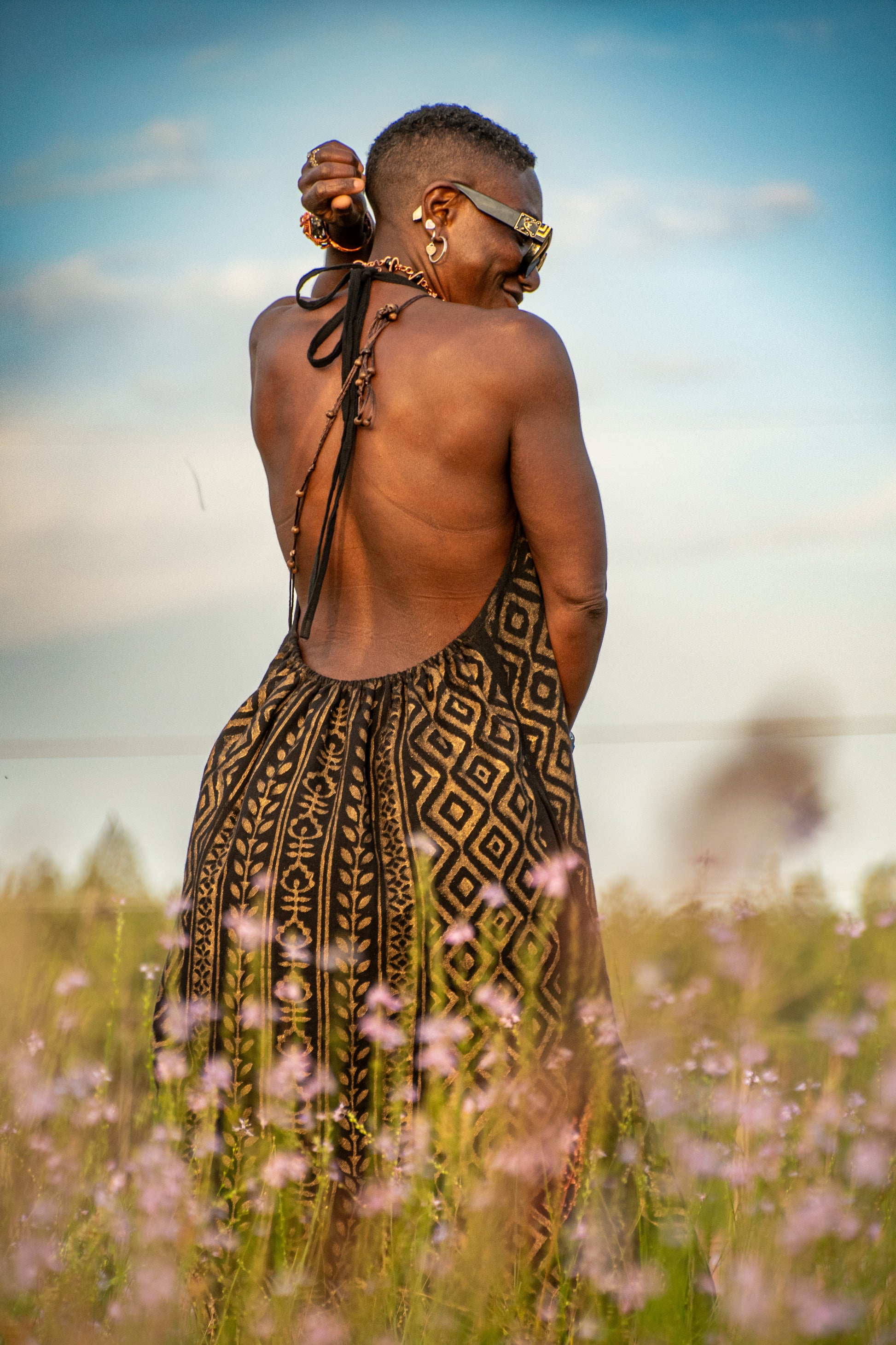 Fierce, feminine, and unapologetically free—Lilith was made to be felt as much as seen. This black halter dress drapes the body with intention, honoring curves and movement in every step. The open back and gentle neckline evoke sensuality, while the grounded weight of natural fibers keeps you rooted in your power. Named after the divine rebel herself, this piece is for the woman who walks with mystery, speaks with fire, and carries softness like a blade of silk.