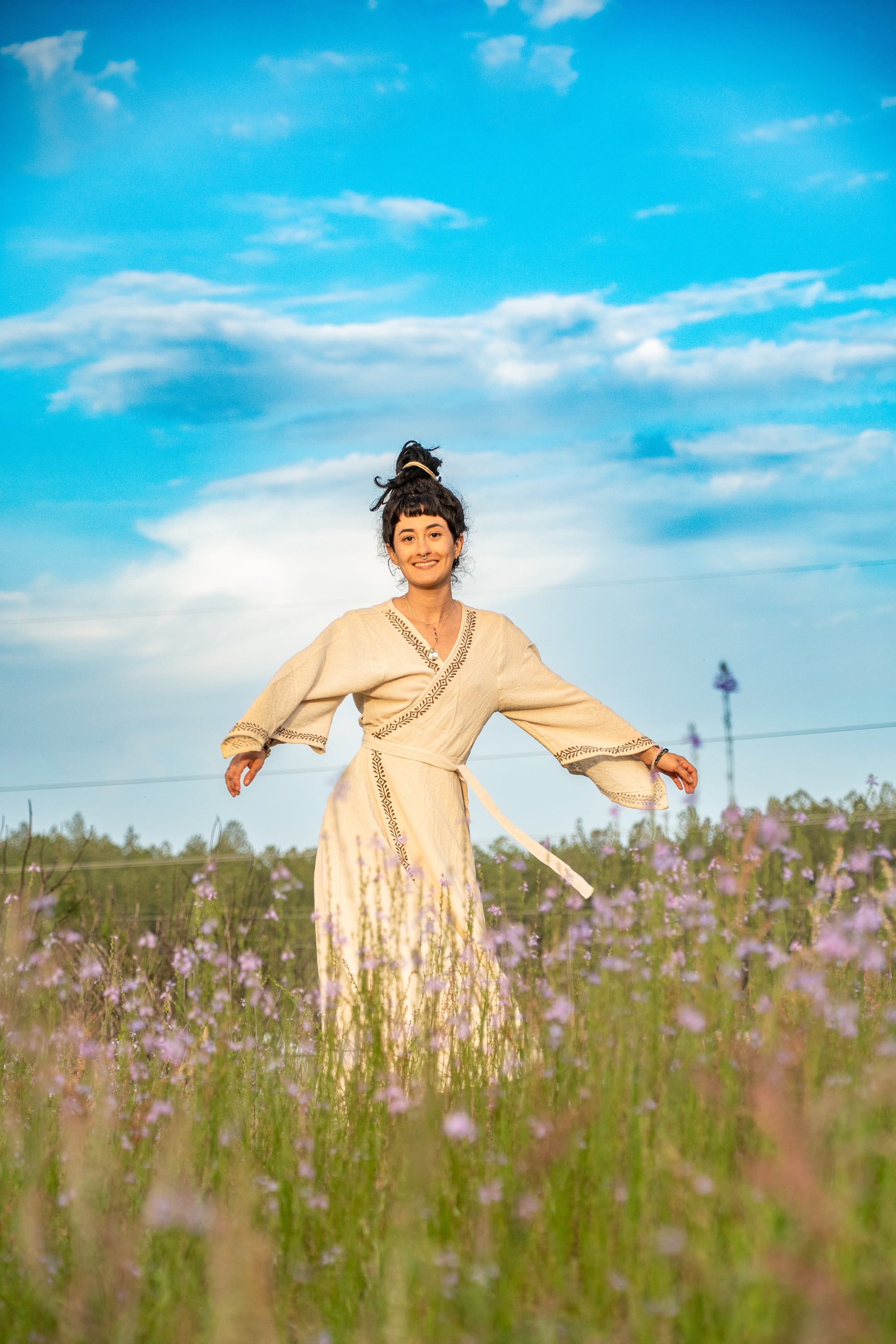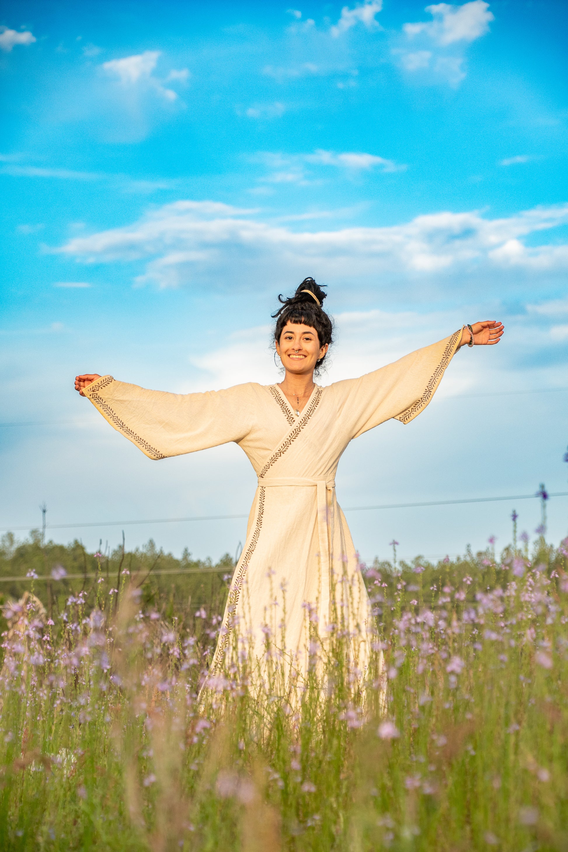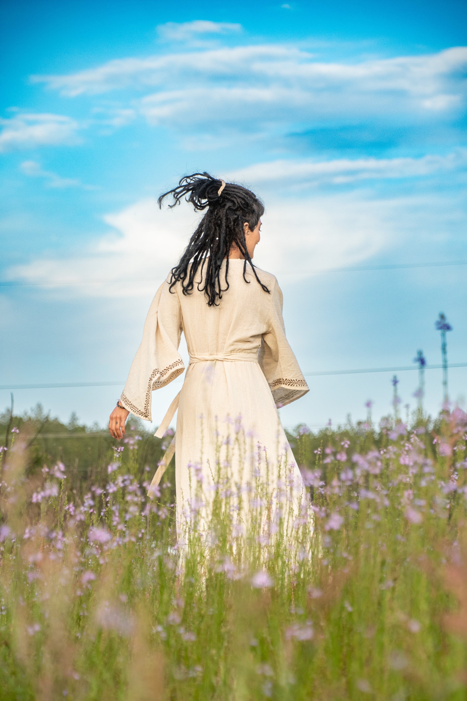 A garment of remembrance and reverence, the Priestess Dress is designed for the woman who carries wisdom in her bones and softness in her step. With flowing long sleeves and a silhouette that drapes like ritual, this piece wraps the body in elegance, ease, and quiet power.